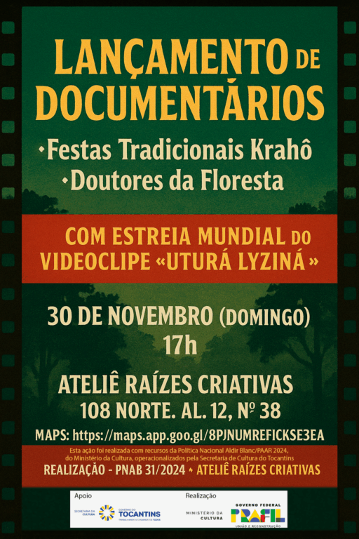 Os projetos “Festas Tradicionais Krahô” e “Doutores da Floresta”, ambos contemplados pelo PNAB 31/2024 do Governo Federal, do edital do Governo do Tocantins,com recursos da Política Nacional Aldir Blanc/PAAR 2024, do Ministério da Cultura, operacionalizados pela Secretaria de Cultura do Tocantins, apresentarão seus materiais audiovisuais resultantes no próximo domingo, às 17h do dia 30 de novembro, no Ateliê Raízes Criativas, que recentemente obteve a certificação como Ponto de Cultura.