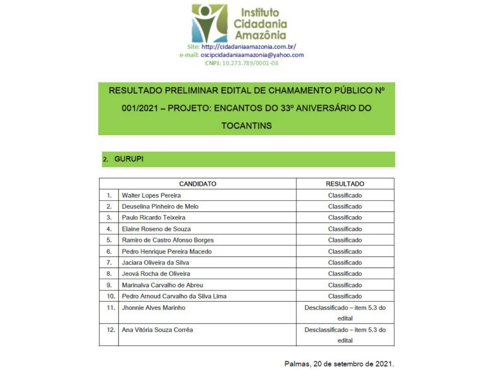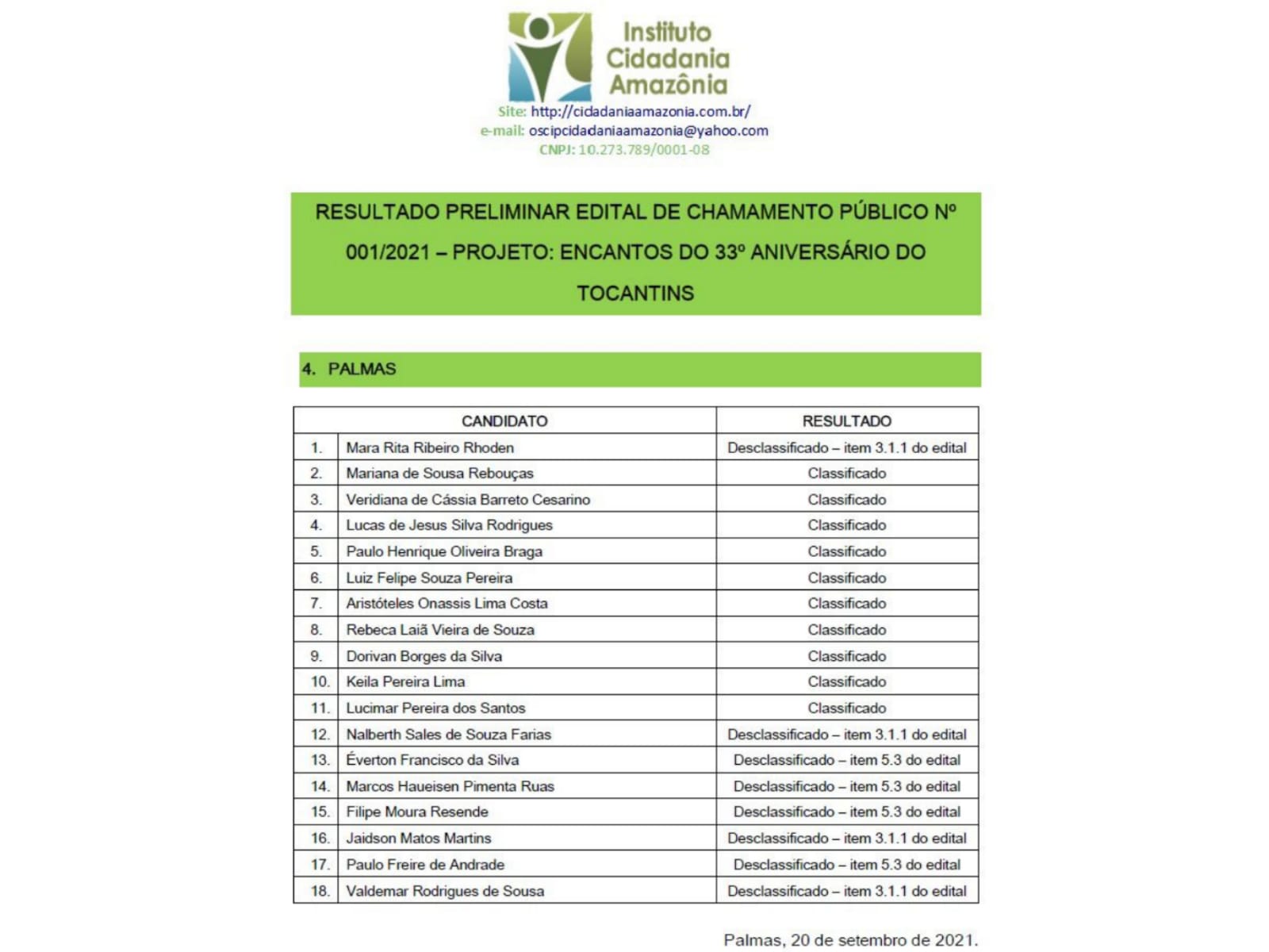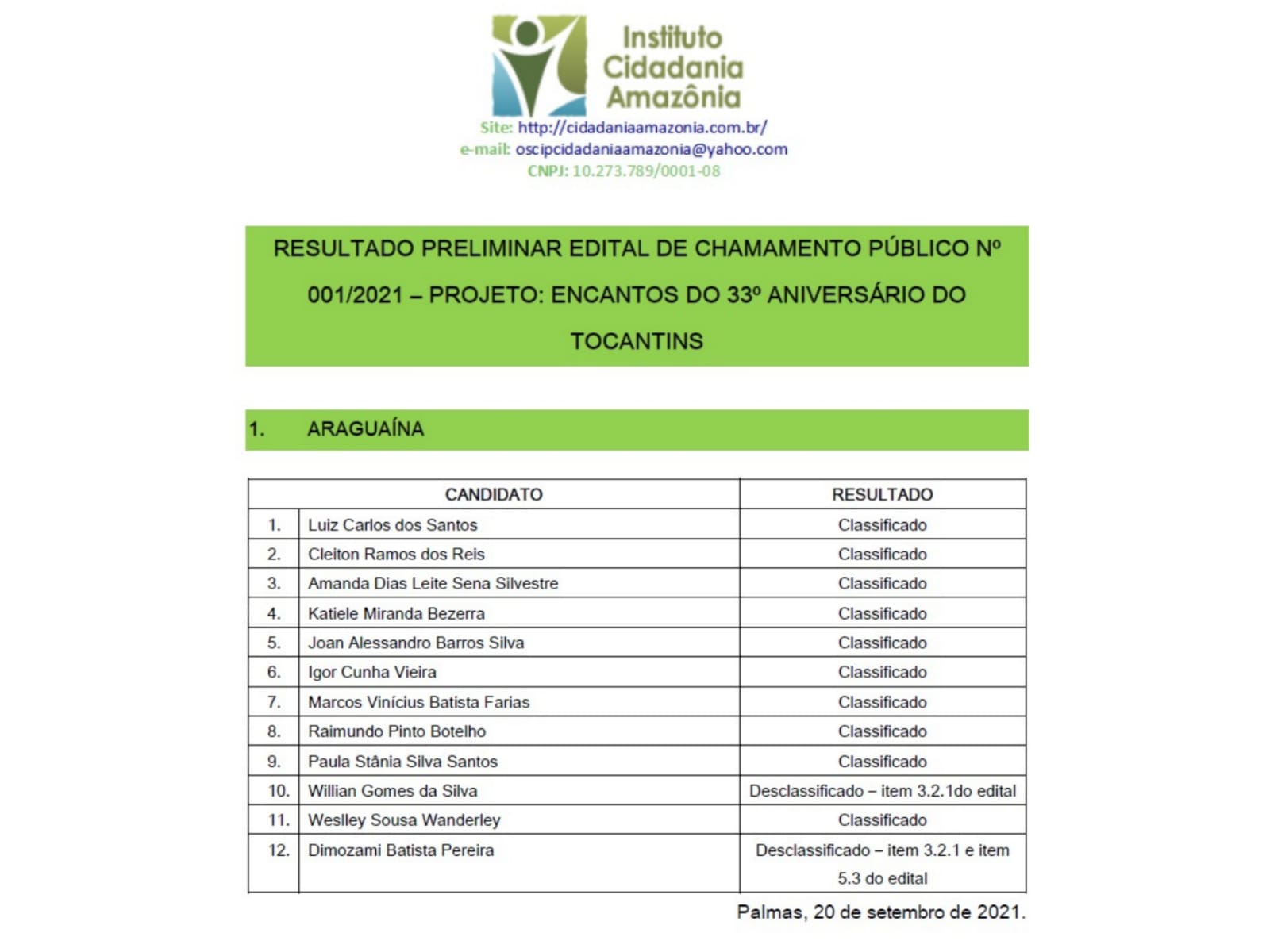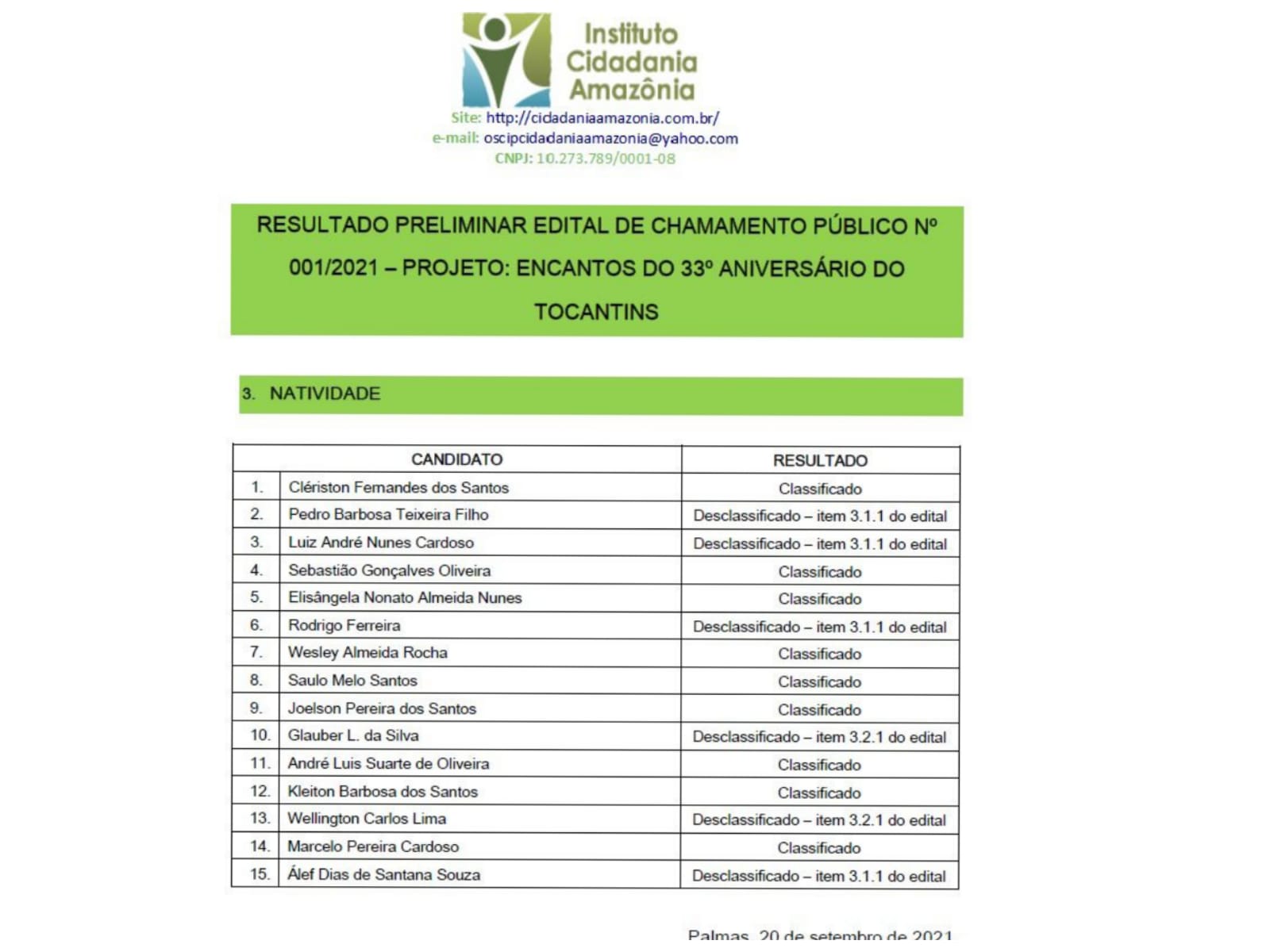 O resultado preliminar do Chamamento Público nº 001/2021 – Projeto Encantos do 33º Aniversário do Tocantins foi divulgado nesta segunda, 20, pelo Instituto. As listas trazem classificados e desclassificados por região. Contatos deverão ocorrer por meio do e-mail [email protected].