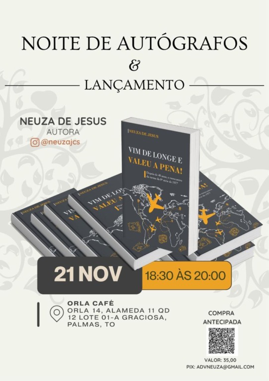 Uma história real sobre a força dos laços de amizade que resistem ao tempo. É com essa premissa que a escritora Neuza de Jesus, tocantinopolina de nascimento, mas palmense de coração, lança nesta sexta-feira, 21 de novembro de 2025, o seu livro de estreia: “Vim de longe e Valeu a pena! Depois de 40 anos, o reencontro da turma da 8ª série de 1977”. A noite de autógrafos acontecerá em Palmas na Orla Café, a partir das 18h30.
