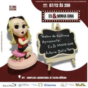 O aclamado espetáculo “Eu & Minha Gina”, que vem conquistando o público por onde passa, fará sua última apresentação deste ano em grande estilo. O encerramento da temporada será no dia 07 de dezembro, às 20h, no Complexo Laboratorial de Teatro HÔÔXWA, localizado na Universidade Federal do Tocantins (UFT). Ingressos serão doados para estudantes universitários da UFT em formato de cortesia, proporcionando um momento especial de arte e reflexão acessível a todos.