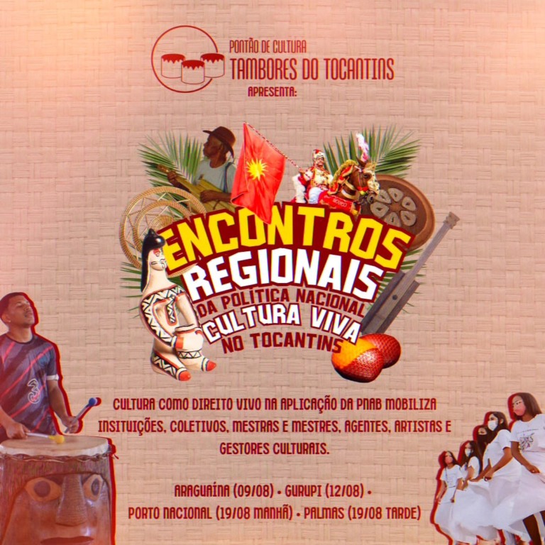 O Tocantins será palco, ao longo deste mês de agosto, dos Encontros Regionais da Política Nacional Cultura Viva (PNCV), que acontecerão nas cidades de Araguaína (09/08), Gurupi (12/08), Porto Nacional (19/08) e Palmas (19/08). Sob o tema “Tecendo Saberes e Territórios – Redes em Movimento e a Celebração dos Povos que Fazem da Cultura um Direito Vivo na Política Nacional Aldir Blanc (PNAB)”, o evento reunirá mestres e mestras da cultura popular, artistas, coletivos, movimentos sociais, gestores e agentes culturais de diversas regiões do estado.