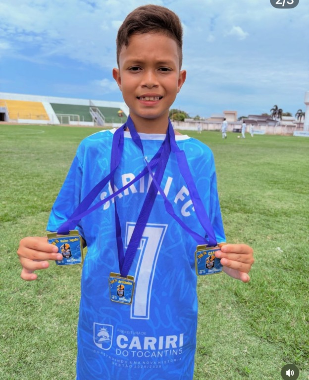 Aluno da rede municipal de Cariri do Tocantins, Arthur Minoru Batista Tanaka, filho de Tayná Ayume Ponciano Tanaka e Pablu Washigton Batista Glória, combina talento natural com uma rotina intensa de dedicação, treinando todos os dias. “Ele chega da escola e já quer ir pro futebol. Toda competição quer participar e a gente sempre está apoiando e incentivando o sonho dele”, destaca a mãe e conta com investimentos importantes da família, como participação em escolinha de alto rendimento em Gurupi e acompanhamento profissional com nutricionista e endocrinologista, reforçando sua formação física e técnica desde cedo.