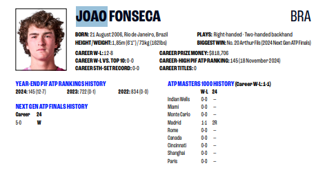 Já na terceira rodada, enfrentando o experiente chileno Nicolás Jarry, ex-número 18 do mundo e dono de um potente saque, Fonseca acabou sendo superado por 3 sets a 1 (6/3, 6/4, 3/6 e 7/6). Apesar da eliminação, sua campanha foi extremamente positiva, especialmente por se tratar de sua primeira participação no torneio. Como recompensa, João Fonseca entrou no top 50 do ranking da ATP, tornando-se o brasileiro mais jovem da história a alcançar essa posição.