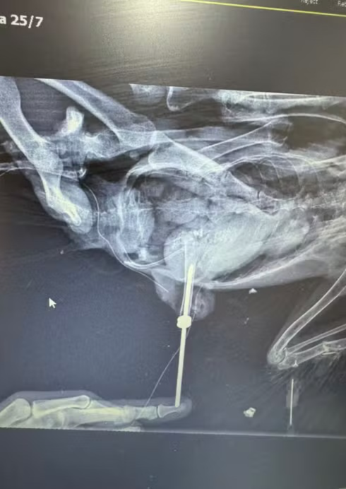 A avaliação clínica revelou déficit de propriocepção e atrofia muscular severa no membro, quadro confirmado por radiografia, que mostrou uma fratura antiga com reabsorção óssea. Diante do diagnóstico, a equipe decidiu pela amputação e implantação de uma prótese osseointegrada com pino medular, que permite a fixação direta ao osso.