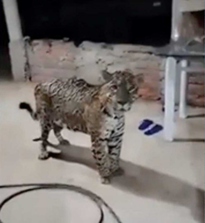 Depois de alguns segundos encarando a casa, a onça simplesmente se vira e vai embora. Caminha devagar pela varanda e desaparece na escuridão, sem avançar ou demonstrar agressividade, como se estivesse apenas cumprindo mais uma ronda noturna.