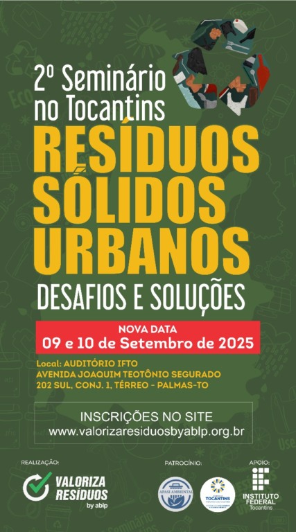 O seminário será realizado no Auditório do IFTO, Avenida Joaquim Teotônio Segurado, Quadra 202 Sul, ACSU-SE20, Conjunto 1, Lote 8, Térreo, Palmas-TO. As inscrições estão abertas e podem ser feitas no site do IVR www.valorizaresiduosbyablp.org.br, onde também é possível conferir a programação completa e os horários do evento. O investimento para associados e estudantes é de R$ 60,00. Para não associados, R$ 120,00.