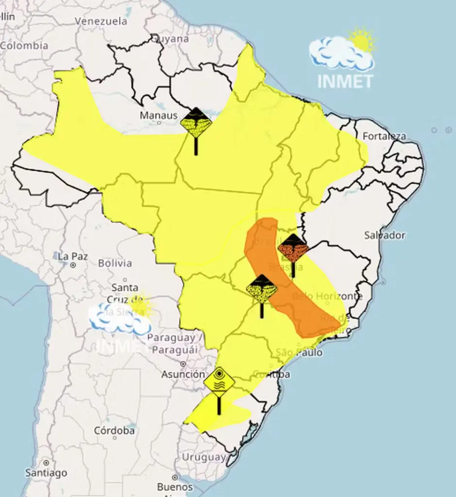 Segundo o Inmet, o volume de chuva pode chegar a 50 milímetros, acompanhado de ventos com velocidade entre 40 e 60 km/h. Apesar do baixo risco, há possibilidade de ocorrências como cortes no fornecimento de energia elétrica, quedas de galhos de árvores, alagamentos e descargas elétricas.