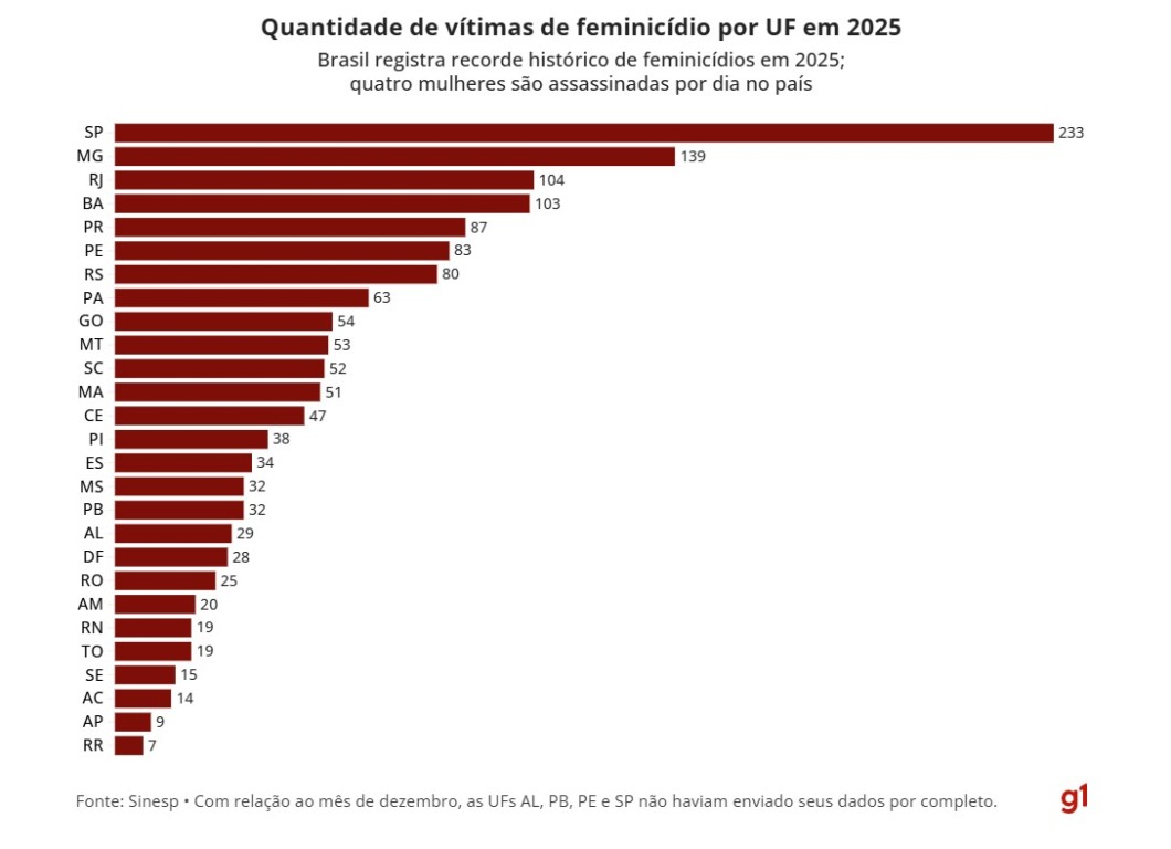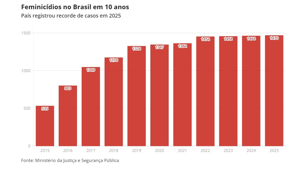 O número de feminicídios bateu recorde no Brasil em 2025: foram 1.470 casos de janeiro a dezembro, conforme dados do Ministério da Justiça e Segurança Pública. O total supera os 1.464 registros de 2024, a maior marca até então.
