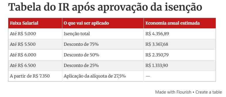 O presidente da República, Luiz Inácio Lula da Silva (PT), sancionou, em 26 de novembro de 2025, o Projeto de Lei nº 1.087/2025. O texto zera a cobrança de Imposto de Renda (IR) para quem recebe até R$ 5 mil por mês e reduz a cobrança para as pessoas com remuneração mensal de até R$ 7.350.