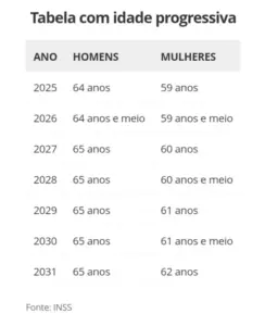Nesta categoria, a idade mínima para se aposentar é progressiva e sobe seis meses anualmente. Além disso, é exigido um tempo mínimo de contribuição de 30 anos para as mulheres e de 35 para os homens.