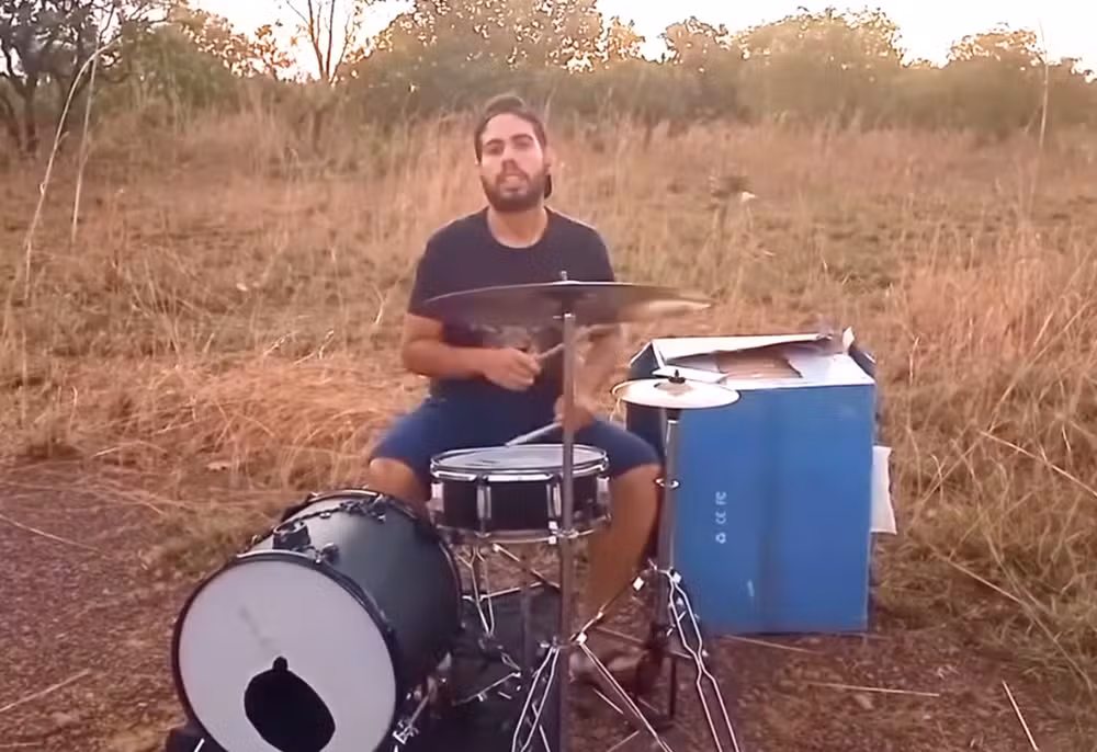 Foi dali, cercado pela vegetação, que os vídeos do tocantinense começaram a circular e chamar atenção pela cena inusitada de um baterista levando o instrumento para um refúgio improvisado para continuar tocando.