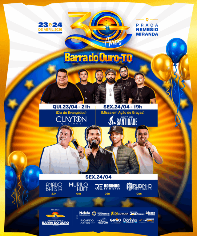 O ponto alto das comemorações pelos 30 anos de Barra do Ouro será marcado por grandes atrações musicais nacionais, que prometem reunir um público expressivo e animar a cidade. Entre os destaques confirmados estão os shows dos cantores Amado Batista e Murilo Huff. Consagrado nacionalmente, Amado Batista deve levar ao palco sucessos que atravessam gerações, trazendo um clima de romantismo e nostalgia. Já Murilo Huff, um dos nomes em ascensão do sertanejo, promete um espetáculo marcado por energia e interação com o público. Após os shows, sobem ainda ao palco os cantores Robinho Estilizado e Rubinho Rodrigues.