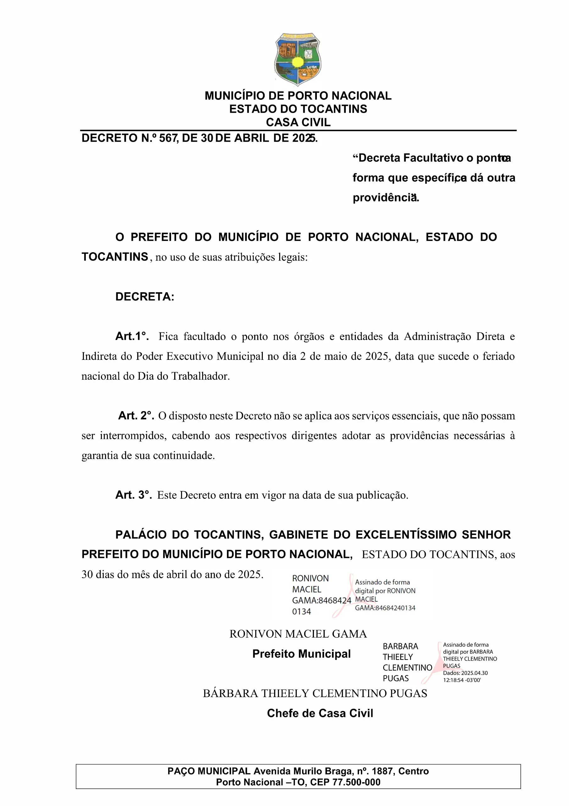 O decreto municipal, de n. 567 de 30 de abril de 2025, segue o adotado pelo governo federal e pelo governo do Tocantins.