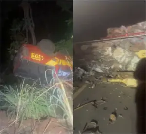 Imagens captadas no local mostram o veículo despedaçado no meio da estrada e a van destruída às margens da TO-010.