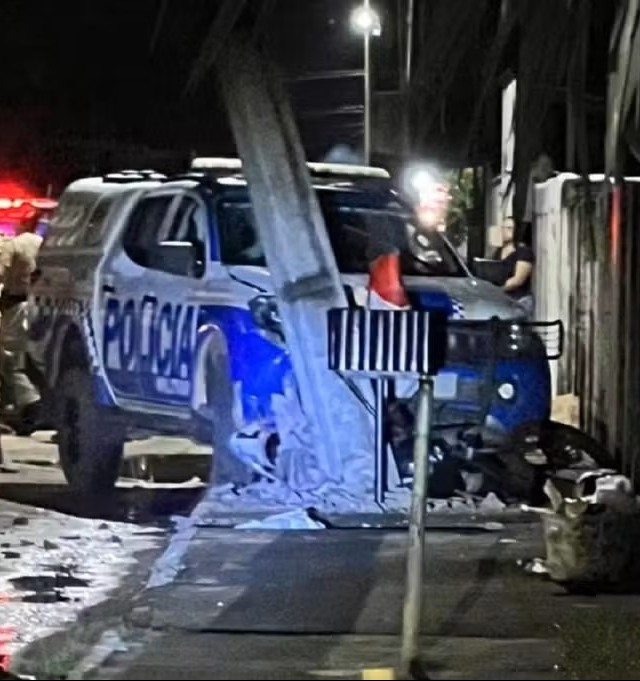 As imagens registram os dois veículos em alta velocidade por uma rua da cidade. A viatura aparece muito próxima da motocicleta conduzida pelo jovem. Poucos segundos depois, Gustavo perde o controle do veículo e é lançado contra um poste de iluminação pública. Com a força do impacto, a estrutura de concreto se parte e cai sobre ele.