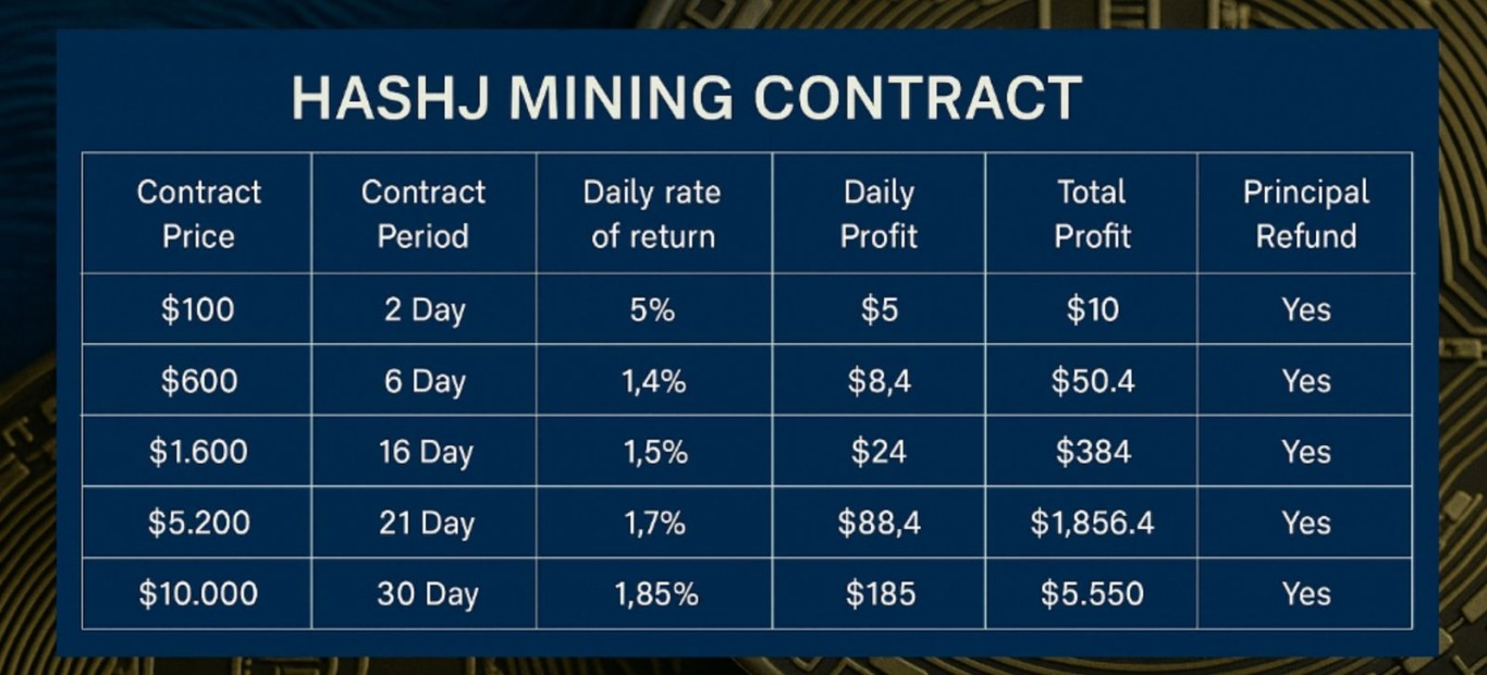 As fazendas de mineração otimizadas pelo Hashj garantem retornos em dólar por dia, de acordo com o plano escolhido. - Sem Hardware Necessário