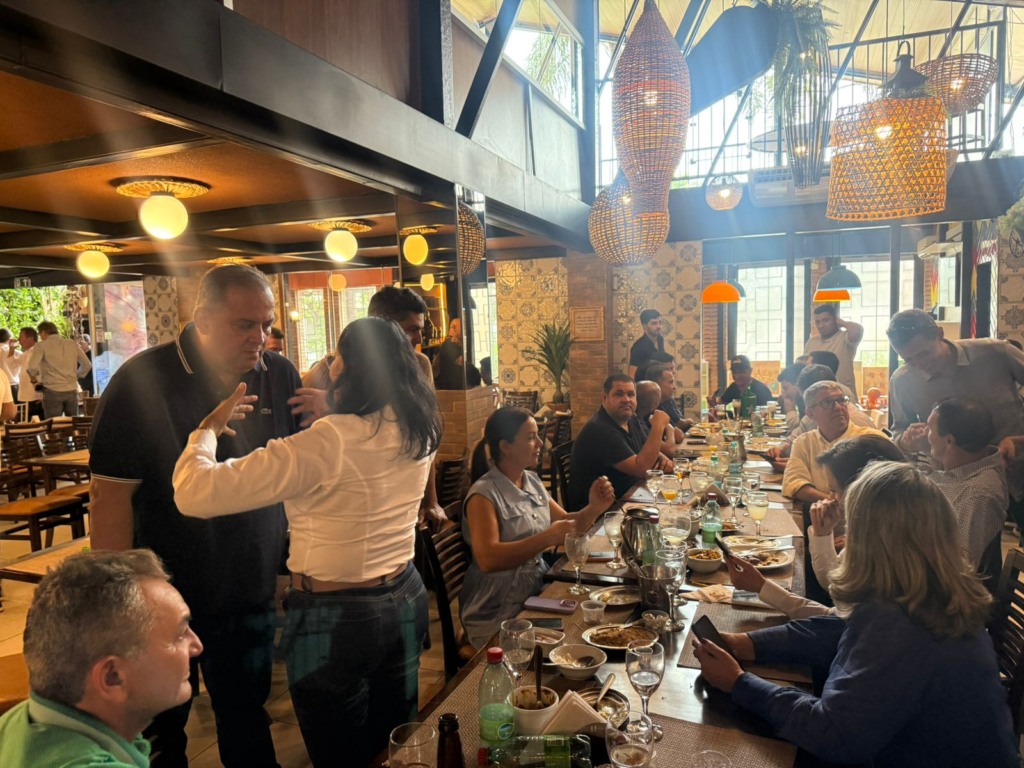 Aliados almoçam juntos em comemoração junto com prefeitos e deputados. Estão num restaurante em Palmas; os senadores Eduardo Gomes e Professora Dorinha além dos deputados Carlos Gaguim, Claudia Lelis e prefeitos. O presidente da ATM, Big Jow também está no local. Eles fazem ligações em vídeo e comemoram a notícia.