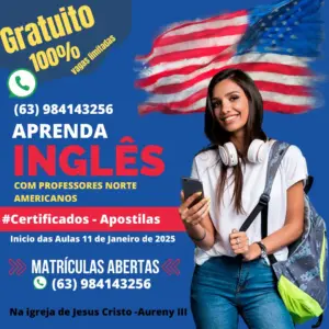A Igreja de Jesus Cristo no Aureny III irá ministrar curso gratuito de Inglês para a comunidade. As aulas serão com professores dos Estados Unidos e todo o material será disponibilizado aos interessados. As aulas acontecem sempre aos sábados, às 10 horas da manhã, e começam a partir do dia 11 de janeiro de 2025, na própria sede da igreja, com salas climatizadas. Além disso, as apostilas que complementam o curso serão disponibilizadas também gratuitamente.