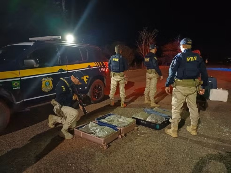 O veículo foi parado durante uma fiscalização no posto da PRF, no km 666. Os entorpecentes estavam divididos em duas malas.