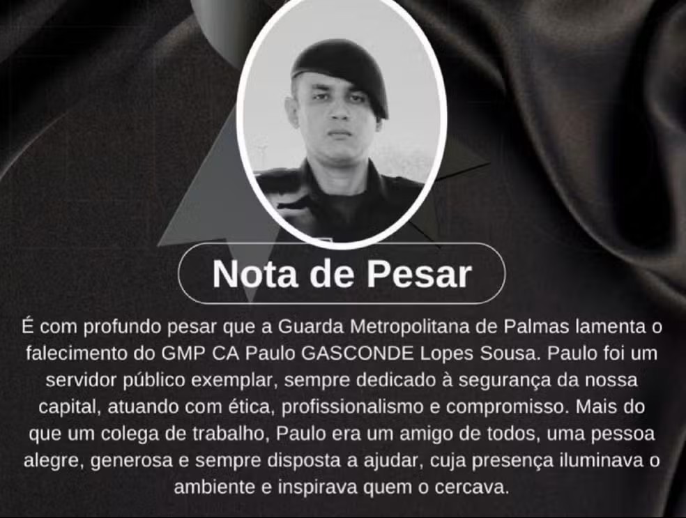 Paulo Gasconde atuava na Divisão Ambiental da Guarda Metropolitana de Palmas. Em nota, a corporação lamentou a perda e destacou que ele era “um servidor público exemplar”.