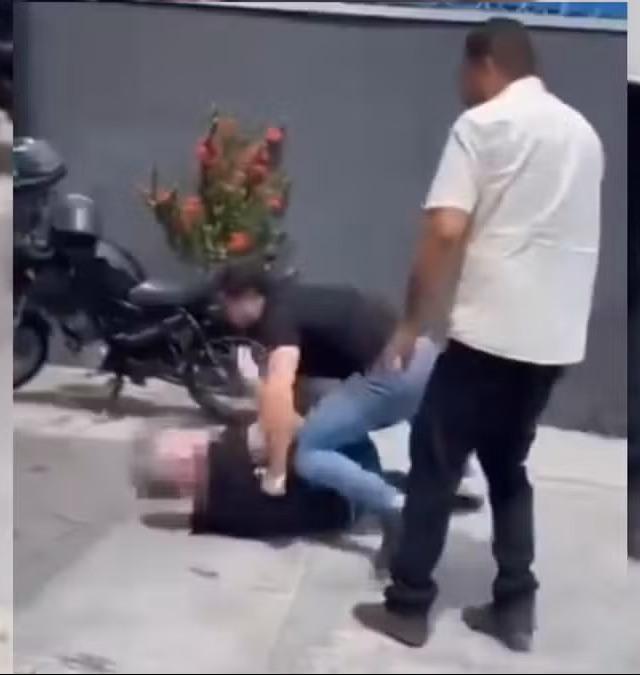 As imagens mostram um dos homens aguardando o outro do lado de fora. Assim que se encontram, os dois passam a trocar socos e chutes. Em seguida, duas pessoas tentam apartar a briga, mas a situação se agrava com a chegada de um terceiro envolvido. Testemunhas que estavam no local também registraram a cena com celulares.