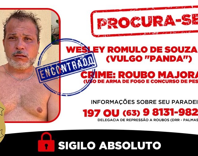 Na tarde da última quarta-feira (15), a Polícia Civil do Tocantins prendeu Wesley Rômulo de Souza Costa, de 32 anos, conhecido como “Panda”. Ele é investigado por roubo com uso de arma de fogo e participação de mais de uma pessoa.