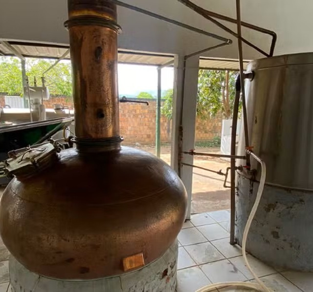 Imagens registradas durante a ação mostram garrafas plásticas repletas de bebidas alcoólicas, além de tambores e um alambique, equipamento utilizado na destilação de líquidos como a cachaça artesanal.