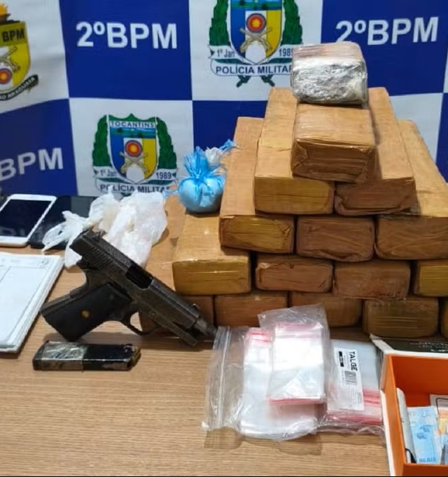 No local, foram apreendidas embalagens usadas no tráfico, 77 gramas de cocaína, celulares, anotações e R$ 73 em dinheiro. A arma jogada pela janela era uma pistola calibre .380 com numeração suprimida e seis munições intactas.