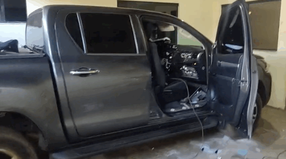 A caminhonete estava em uma casa usada como cativeiro pelos criminosos. O veículo já estava parcialmente desmontado quando a polícia chegou ao local. No imóvel foram encontrados aparelhos como bloqueadores de sinal de GPS, aparelhos para codificação de chaves e ignição de veículos, além dos conjuntos de placas das outras duas caminhonetes furtadas e um outro veículo também alvo de furto.