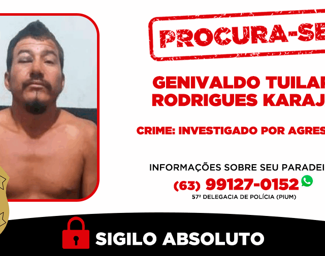 A Polícia Civil do Tocantins, por meio da 57ª Delegacia de Polícia de Pium, está à procura de Genivaldo Tuilari Rodrigues Nogueira Karajá, 40 anos, investigado por agressões e abusos contra uma mulher e sua filha na comunidade indígena Aldeia Ìtaro Awa, na região do município de Pium.