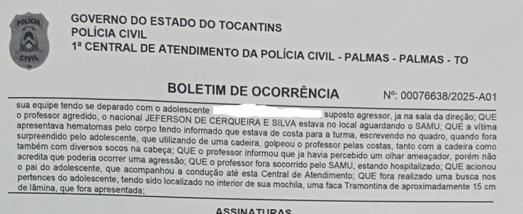De acordo com o boletim, o professor, identificado pelas iniciais J.C.S., estava escrevendo no quadro quando foi surpreendido pelo ataque. O aluno desferiu um golpe com uma cadeira contra o docente e, em seguida, aplicou diversos socos na região da cabeça.