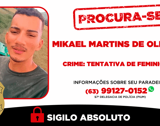 A Polícia Civil do Tocantins está à procura de Mikael Martins de Oliveira, investigado por tentativa de feminicídio contra sua companheira, na cidade de Pium.