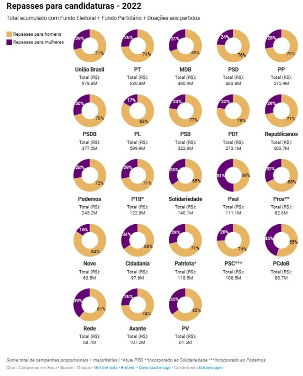 Confira a distribuição de gênero dos recursos de cada partido em 2022: