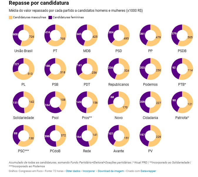 Confira a média de repasses para candidaturas de cada gênero em 2022: