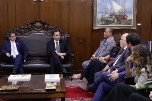 Presidente do Senado Federal, senador Rodrigo Pacheco (PSD-MG), recebe grupo de artistas para tratar sobre direitos autorais no PL 2.338/2023, que regulamenta o uso da Inteligência Artificial (IA) no país. O projeto foi proposto pelo presidente do Senado e tramita no plenário em regime de urgência.