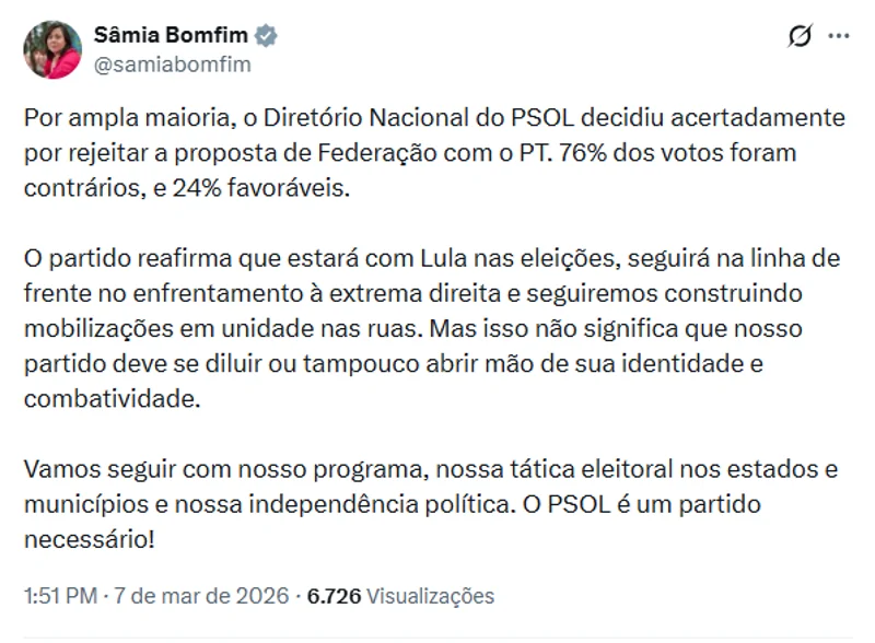 Nas redes sociais, a deputada federal Sâmia Bomfim (Psol-SP) comemorou o resultado e classificou como “acertada” a decisão de não formar federação com o PT.