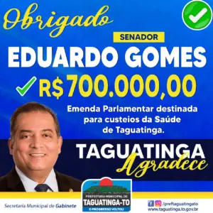 O prefeito de Taguatinga, Paulo Roberto, fez questão de agradecer ao senador Eduardo Gomes a liberação de R$ 700 mil para a saúde do município.
