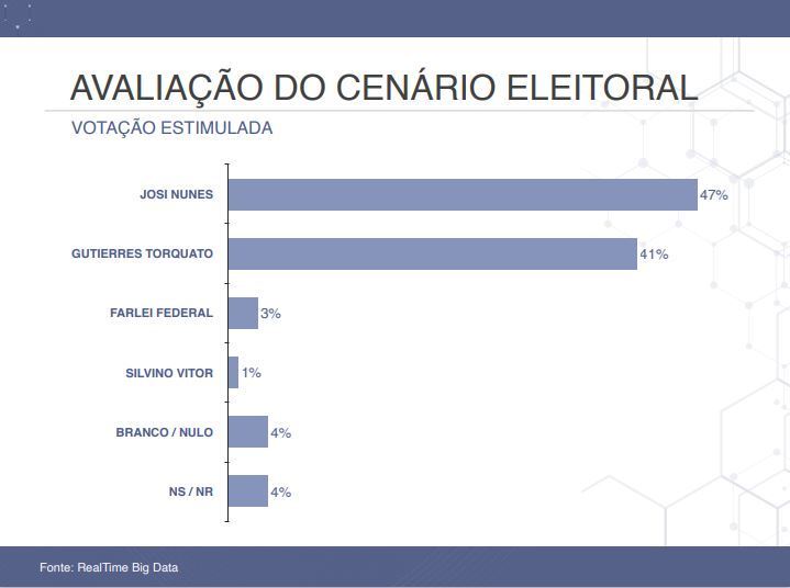 O RealTime Big Data também constatou que Gutierres Torquato é quem tem a maior rejeição entre os candidatos, com 27%. Na sequência aparecem Josi Nunes (23%), Silvino Vitor (11%) e Farlei Federal (7%). Entre os entrevistados, 7% disseram rejeitar todos os candidatos e 18%, nenhum deles. Não sabe ou não responderam, 7%.