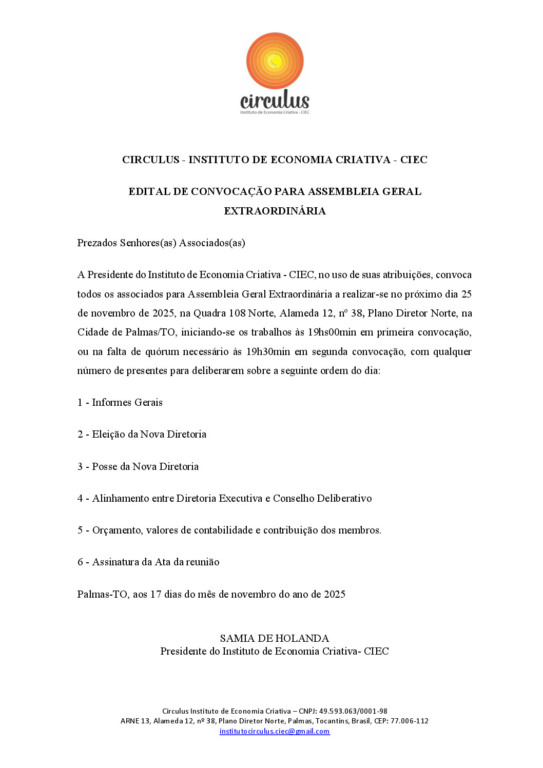 A Presidente do Instituto de Economia Criativa – CIEC, no uso de suas atribuições, convoca todos os associados para Assembleia Geral Extraordinária a realizar-se no próximo dia 25 de novembro de 2025, na Quadra 108 Norte, Alameda 12, nº 38, Plano Diretor Norte,na Cidade de Palmas/TO, iniciando-se os trabalhos às 19hs00min em primeira convocação, ou na falta de quórum necessário às 19h30min em segunda convocação, com qualquer número de presentes para deliberarem sobre a seguinte ordem do dia: