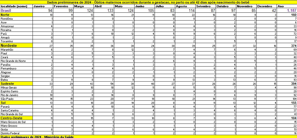 O Brasil registrou 1.187 óbitos maternos ocorridos durante a gestação, no parto ou até 42 dias após o nascimento do bebê em 2024, segundo dados preliminares do Ministério da Saúde. A maioria dessas mortes foi causada por hipertensão (como pré-eclâmpsia e eclâmpsia), hemorragias, infecções e complicações no parto, que poderiam ser evitadas caso tivessem atendimento rápido e cuidados adequados desde o pré-natal.