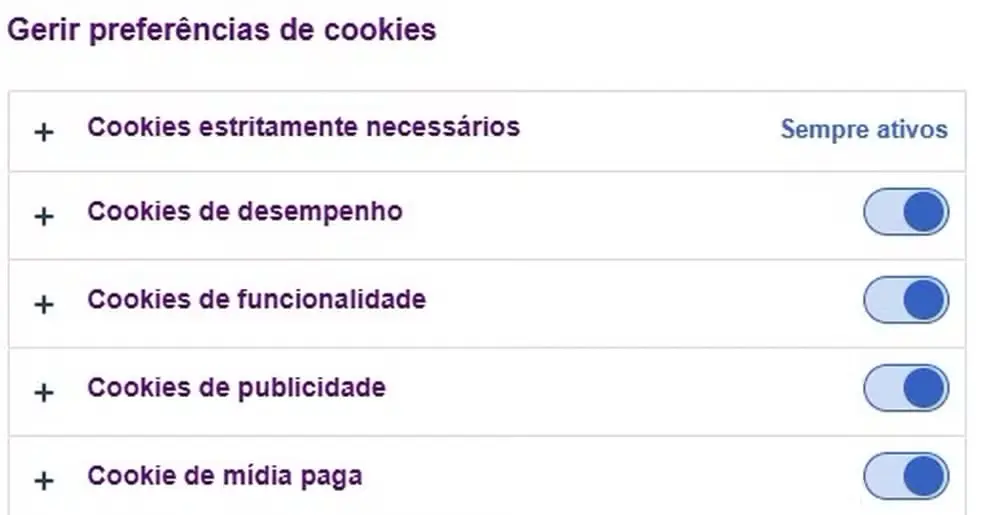 Ao clicar nessa opção, normalmente abre uma janela (“pop-up”) na página onde é possível “ativar” ou “desativar” cada opção de cookie, como se vê abaixo.