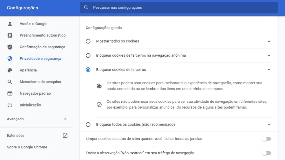Além das configurações para cada site, é possível mudar preferências em navegadores para restringir cookies de terceiros, que também servem para exibir anúncios. Veja como limitar cookies de terceiros nos dois programas no Google Chrome: