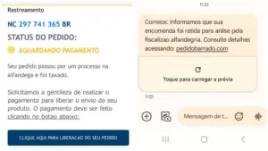 Os golpistas estão simulando ser dos Correios para enviar SMS sobre supostas mercadorias retidas pela alfândega.