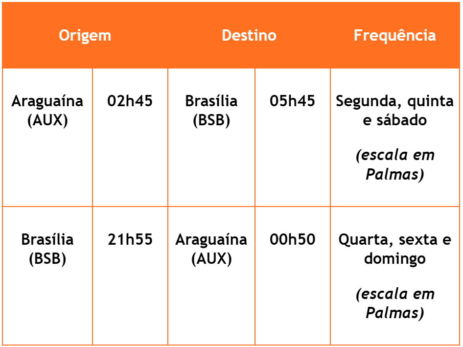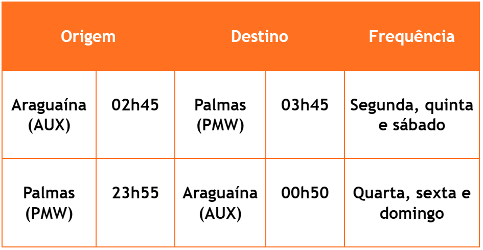 Às segundas, quintas e sábados, o voo G3 2167 da GOL partirá de Araguaína às 2h45, pousando em Palmas às 3h45. A volta, desde Palmas, acontecerá no período noturno com o voo G3 2166, às 23h55 das quartas, sextas e domingos, com aterrissagem em Araguaína às 0h50 do dia seguinte.