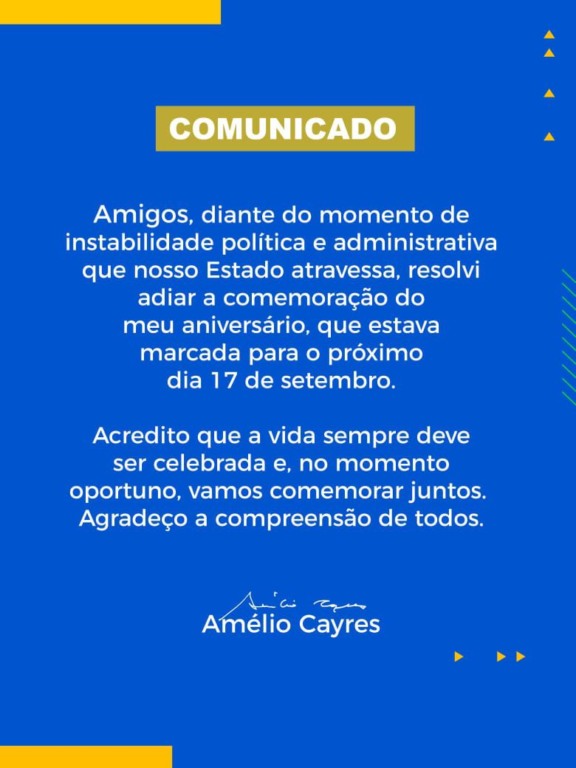 “Amigos, diante do momento de instabilidade política e administrativa que nosso Estado atravessa, resolvi adiar a comemoração do meu aniversário, que estava marcada para o próximo dia 17 de setembro.Acredito que a vida sempre deve ser celebrada e, no momento oportuno, vamos comemorar juntos.Agradeço a compreensão de todos”, afirmou.