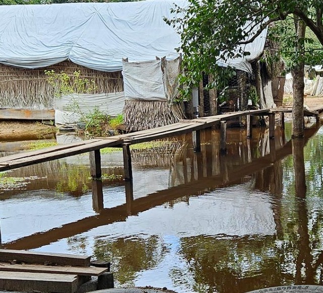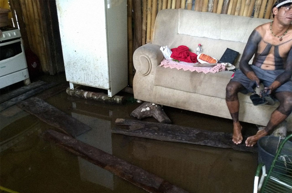 Durante as enchentes, os idosos são levados às pressas para a cidade, onde ficam instalados de forma meio improvisada. A água também coloca a saúde e a alimentação dos indígenas à prova, pois há risco de infecções, morte de peixes, de porcos e a destruição do pouco roçado que existe. “Numa das vezes, uma mulher foi mordida por piranha dentro de casa”, nos conta uma senhora. “Você sabe o que é desejar acordar e colocar o pé no chão e não na água?”, questiona um outro morador da comunidade.