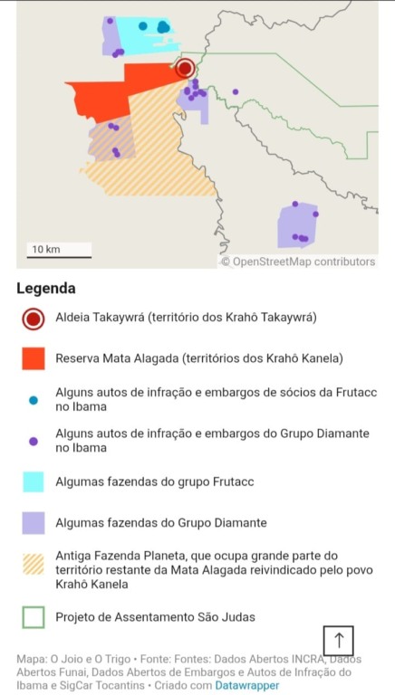 Uma das fazendas da empresa, a Relâmpago, vizinha à Mata Alagada e ao PA São Judas, é citada por outro indígena Krahô Takaywrá, que pediu anonimato temendo represálias.