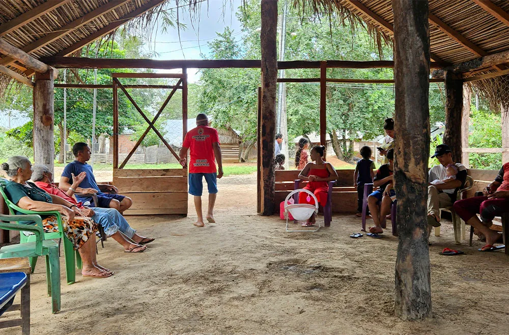 Depois de uma dança e canto de boas-vindas, somos acomodados na área comunitária da aldeia, com grande parte da comunidade. Eles sentam em um círculo, e começa uma rodada de apresentação, seguida de falas, várias falas. Têm muito a contar. Sobre estarem cercados de fazendas de monocultura, sobre o veneno que chega por ar e terra, sobre contaminação da água dos rios, sobre desaparecimento dos peixes e alagamentos constantes que atingem a comunidade.