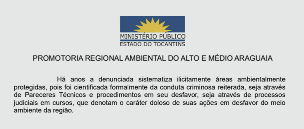 O caso foi tão emblemático que está por trás da própria criação da promotoria ambiental no estado, como afirma Neto. O MPE-TO instalou um procedimento de investigação criminal que gerou uma ação cautelar em caráter antecedente pedindo a suspensão total da retirada de recursos hídricos, da abertura de canais, do represamento e da construção de diques e barragens nos rios Formoso e Urubu pelo agronegócio em áreas superiores a 500 hectares.