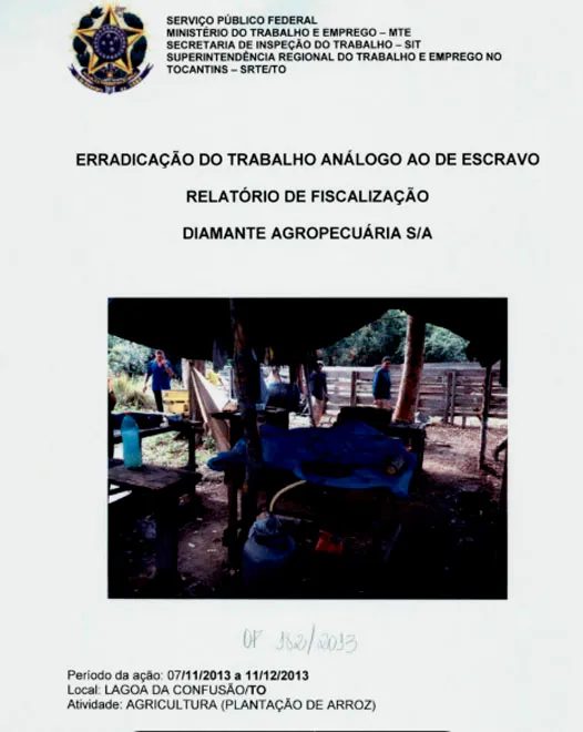 Coroando as infrações do Diamante estão as ilegalidades trabalhistas. Em 2017, o Grupo Diamante foi incluído na Lista Suja do Trabalho Escravo, após uma operação em novembro de 2013 deflagrada por auditores do Ministério do Trabalho e Emprego e agentes da Polícia Federal encontrar trabalhadores em condições degradantes da Fazenda Diamante, de 10 mil hectares, localizada a apenas 13 quilômetros da Reserva Mata Alagada, segundo as coordenadas disponíveis no relatório.
